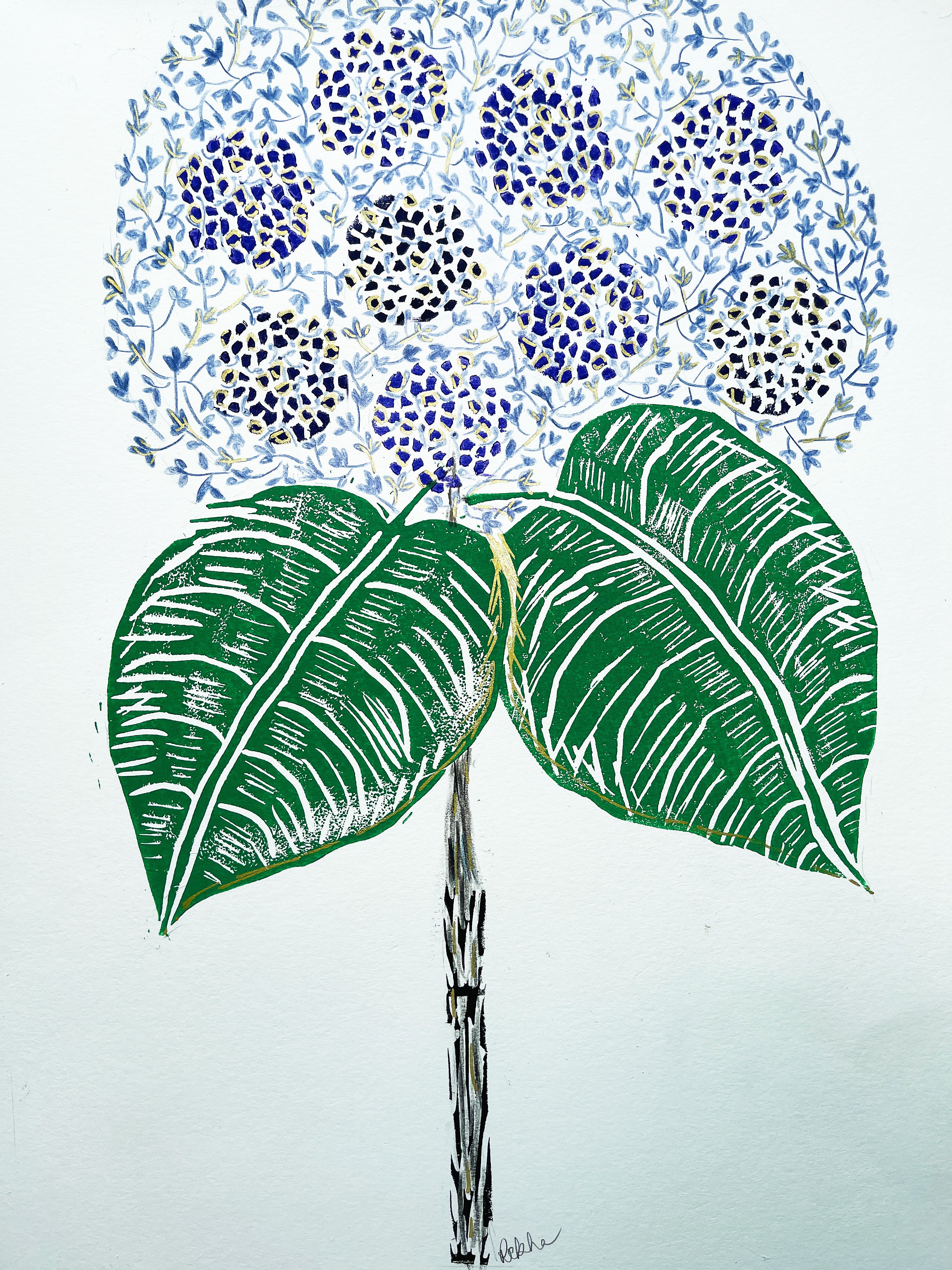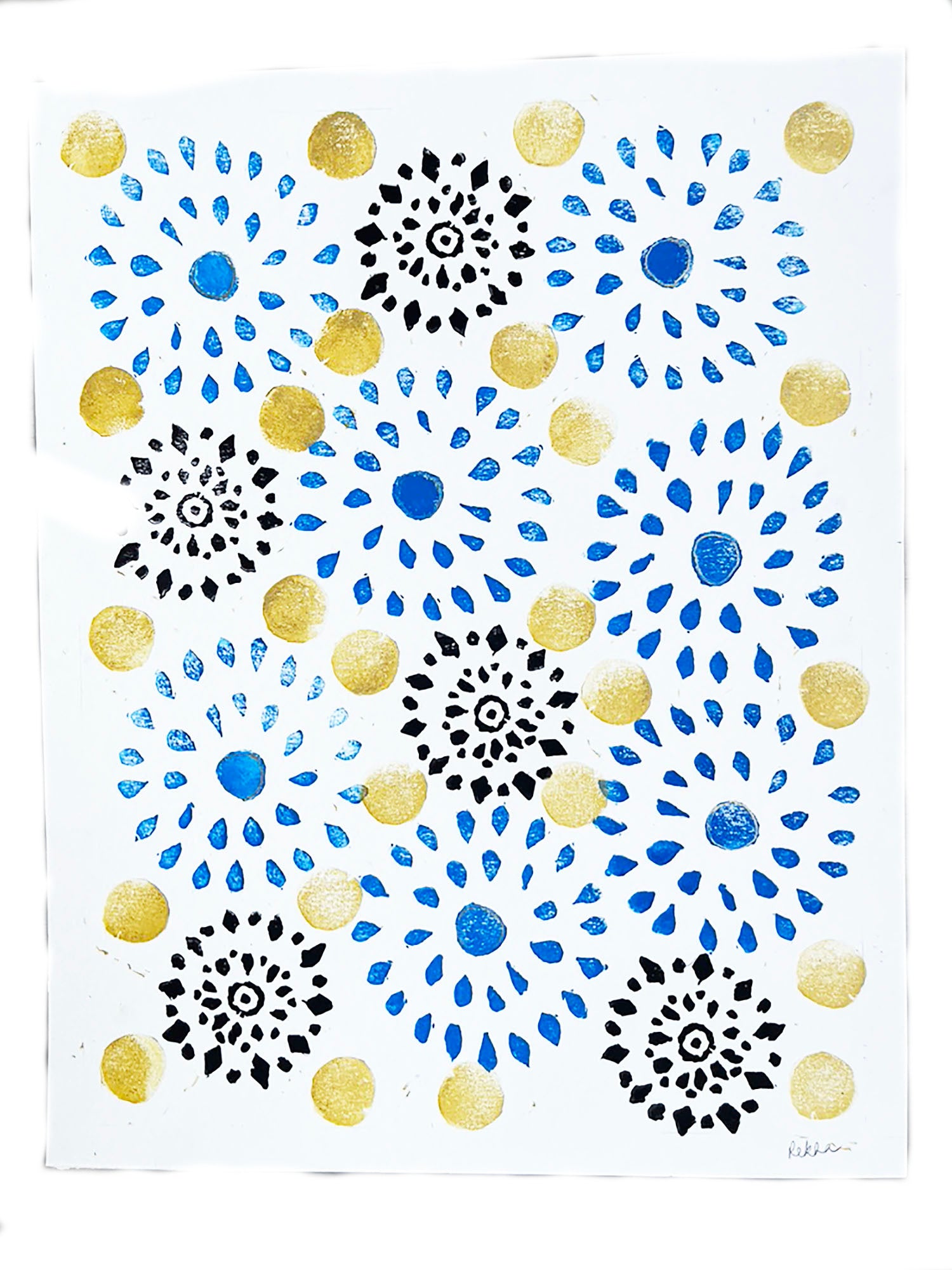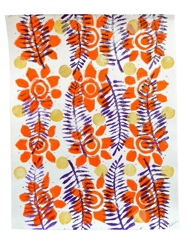 In my printmaking process, I begin by crafting patterns or designs on a gelli plate using acrylic paints, stencils, and various mark-making tools. I then place art paper over the design and create unique monotype prints. Additionally, I hand-carve designs into linoleum blocks, ink them, and produce monoprints on paper.