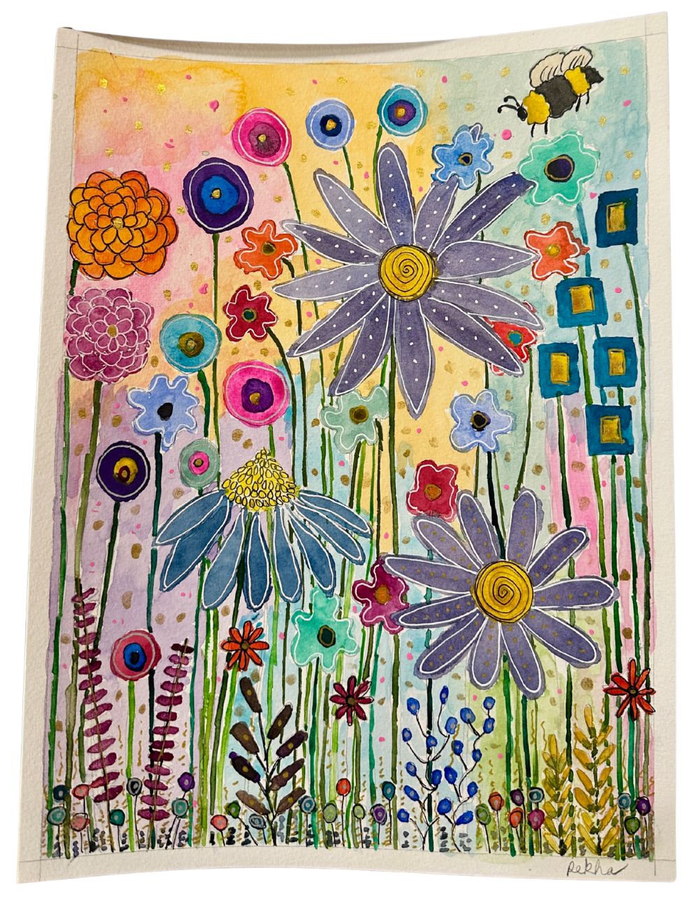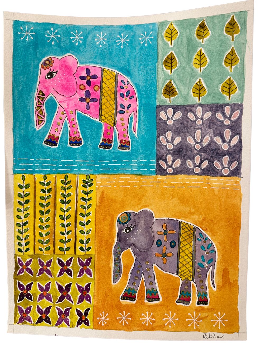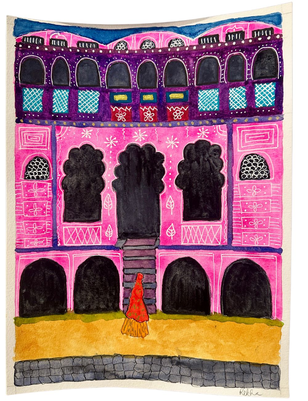 I enjoy combining watercolor with gouache, colored pencils, soft pastels, gel pens, and micron pens to create interesting textures, tones, and contrasts.Â